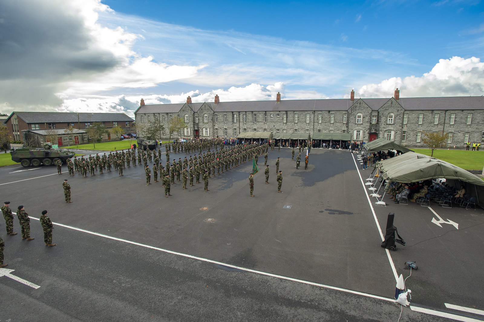 Bhí an searmanas comhdhéanta de pharáid, beannacht ar bhratach aonaid an 121ú Cathlán Coisithe, cigireacht agus óráid ón Aire i nDún Uí Mhaoilíosa, Gaillimh.